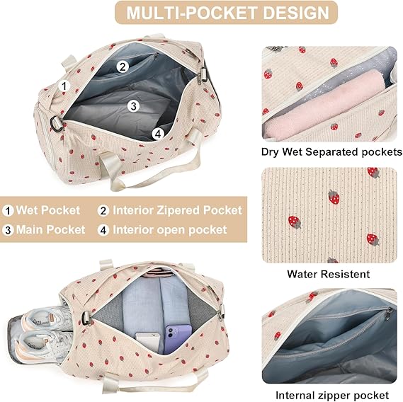 - The girl's corduroy strawberry dance bag with shoe compartment can not only store sneakers and dirty clothes separately, but the plastic wet bag can also store swimsuits, wet towels or toiletries.